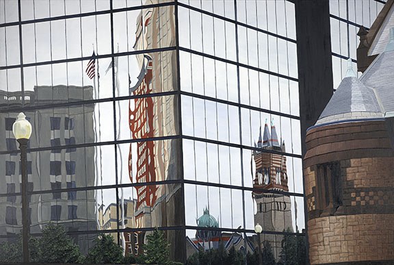 Steinem's Architectural scenes are set in a host of locations, including Montreal, Boston, Manhattan, and Washington D.C. His soaring Cityscapes and historically significant buildings are usually composed on site, with reference sketches and photos. While composing a painting people on the street have often approached him, to gaze at the scene he's composing and remark that they have never noticed those elements before. That's the magic of his architectural pieces, finding the juxtaposition of old and new within the sweeping, sometimes surreal, lines of urban landscapes. Steinem accepts commissioned work on architectural pieces, with prices based on the complexity of the subject and the canvas size. Please contact the artist for details.
